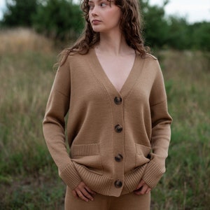 Merino wool cardigan, Beige buttoned sweater, Women’s jacket with pockets and buttons